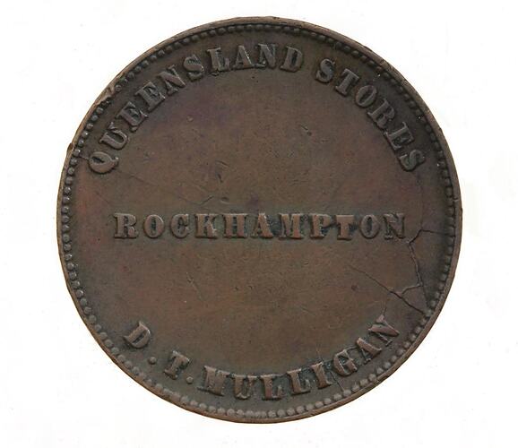 Copper Halfpenny Token, minted by W.J. Taylor, London. Issued by D.T. Mulligan, Queensland Stores, Rockhampton, 1863. It is likely that Mulligan opened his 'Queensland Stores' in either 1862 or 1863, after the discovery of Copper and Gold at nearby Peak Downs. The Early History of Rockhampton includes the following comment about Mulligan and his tokens: 'Copper (coins) were even harder to get than Silver and several of the leading business people had copper tokens struck, which were accepted as pennies, while at the same time they served as advertisements. The late Mr D.J [sic] Mulligan circulated a large number of these tokens, which remained in use for ten or fifteen years.' Mulligan is said to have 'sold out to H.F. Walton, and retired to Ireland, where he died.' (Rockhampton City Council, personal correspondence).