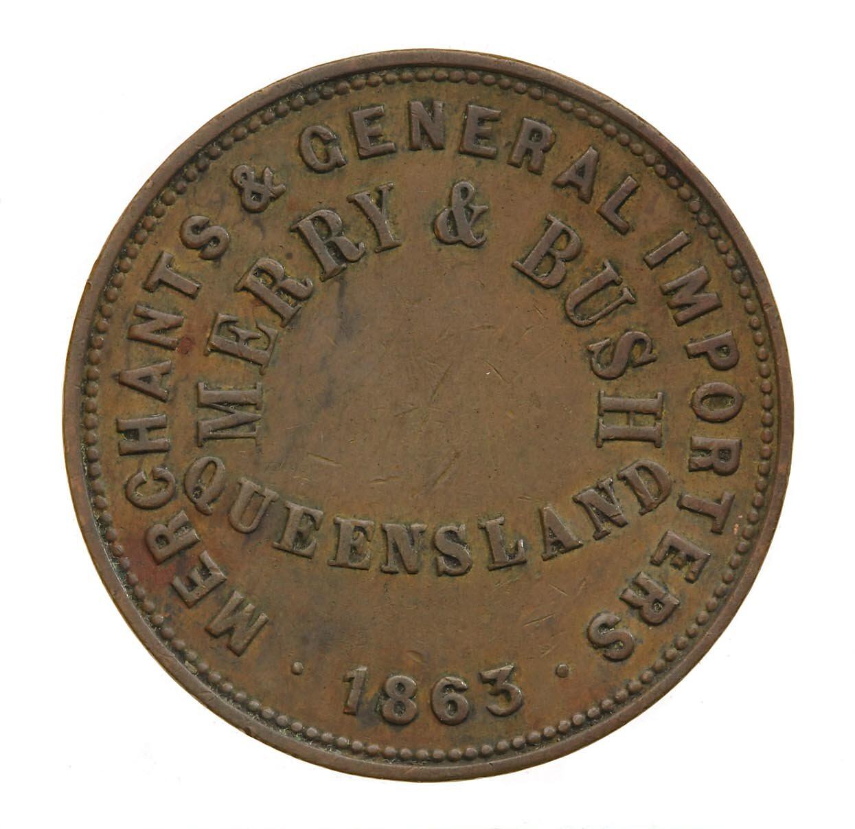 Obverse: MERRY & BUSH QUEENSLAND MERCHANTS & GENERAL IMPORTERS 1863 Reverse: PEACE & PLENTY ADVANCE AUSTRALIA