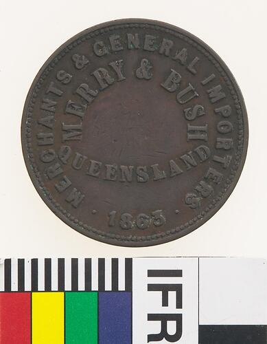 Obverse: MERRY & BUSH QUEENSLAND MERCHANTS & GENERAL IMPORTERS 1863 Reverse: PEACE & PLENTY ADVANCE AUSTRALIA