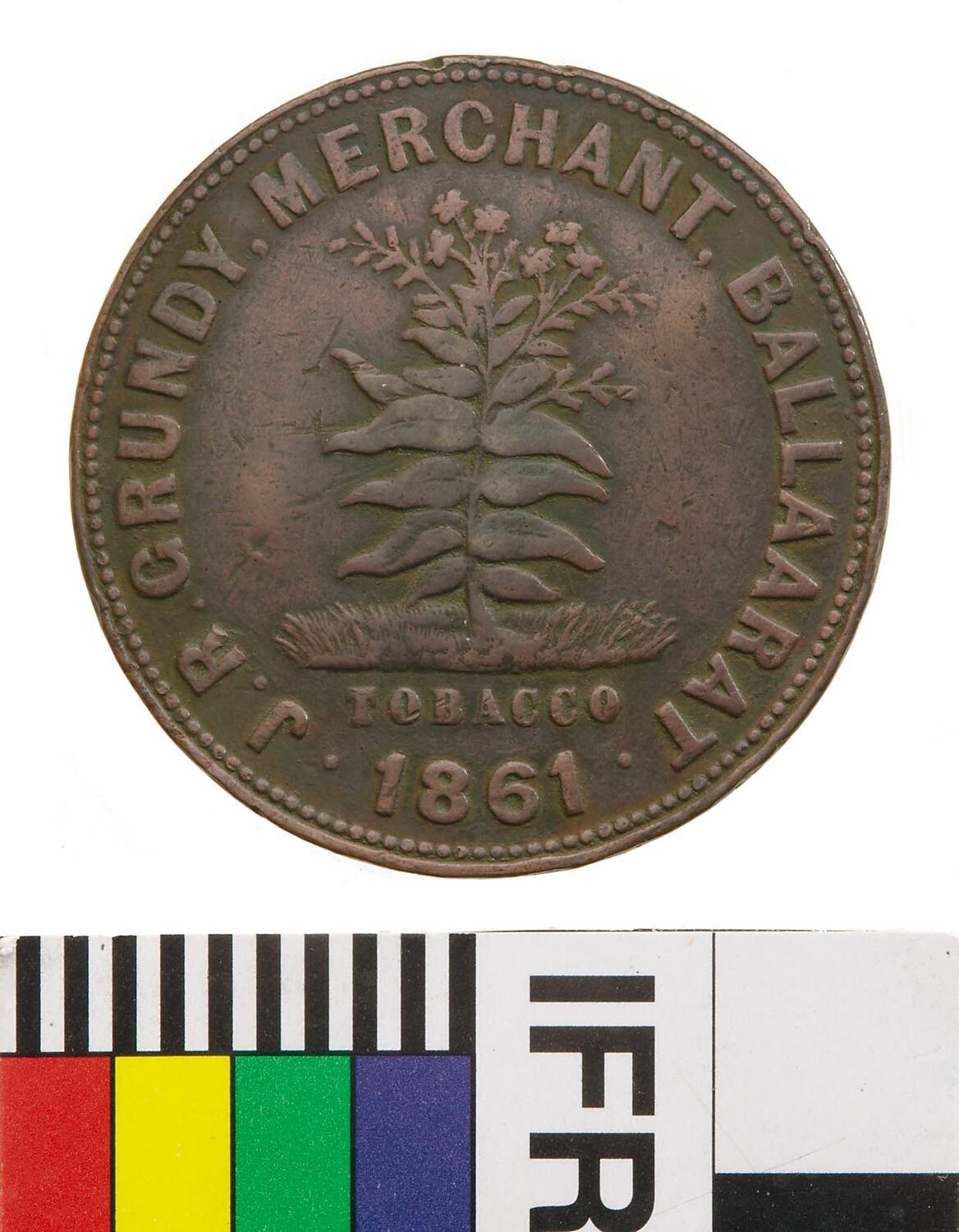 Obverse: J.R. GRUNDY MERCHANT BALLAARAT 1861 TOBACCO Reverse: INDUSTRIA ET FIDES OMNIA VINCENT VICTORIA ADVANCE AUSTRALIA