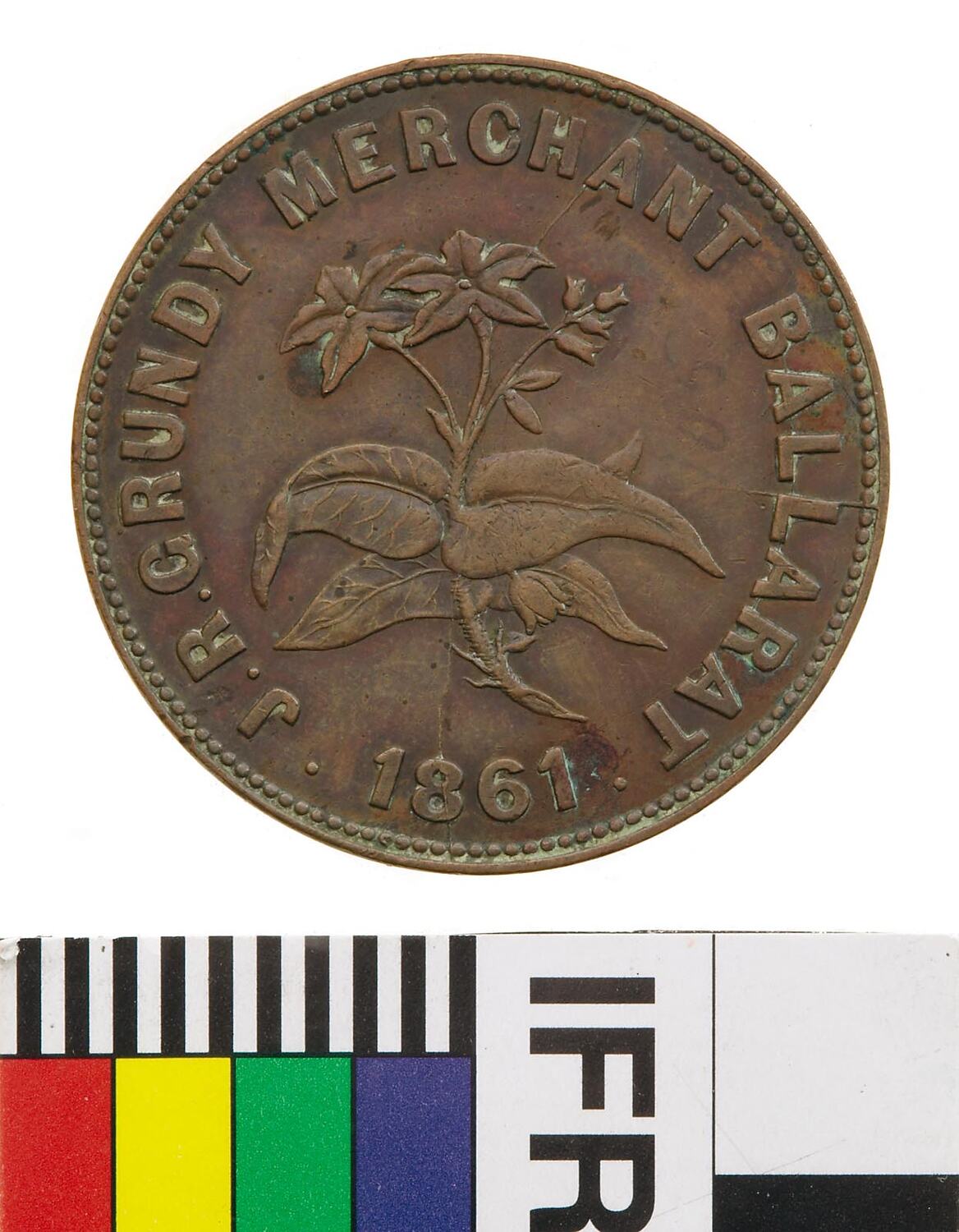 Obverse: J.R. GRUNDY MERCHANT BALLARAT 1861 Reverse: INDUSTRIA ET FIDES OMNIA VINCET VICTORIA