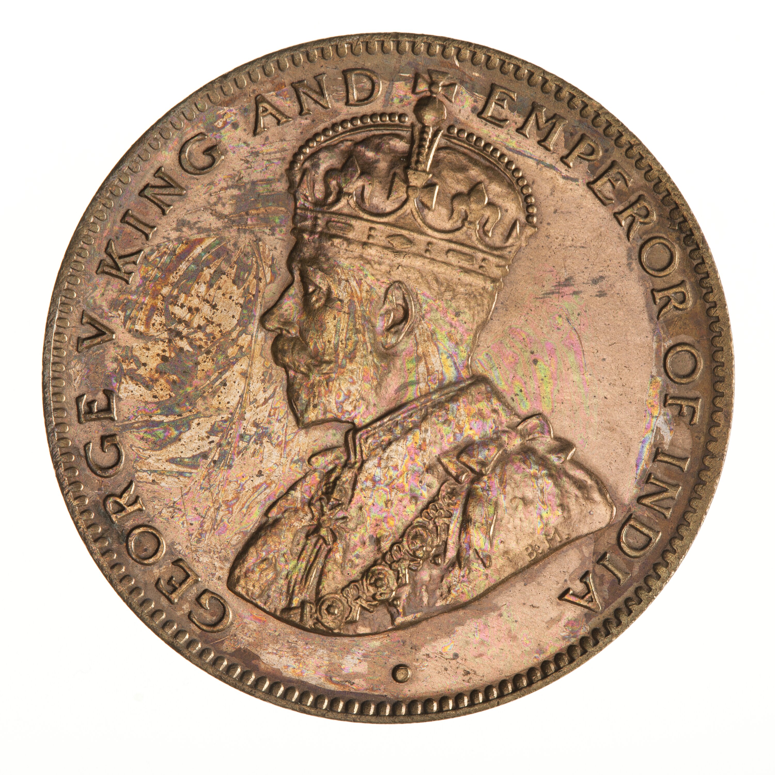 Crowned and draped bust of the King facing left, the King is wearing the Imperial Crown and the ermine Robe of State, the Collar of the Most Noble Order of the Garter, and the Badge of the Most Honourable Order of the Bath; around, GEORGE V KING AND EMPEROR OF INDIA; on bust truncation, the artist's initials, BM