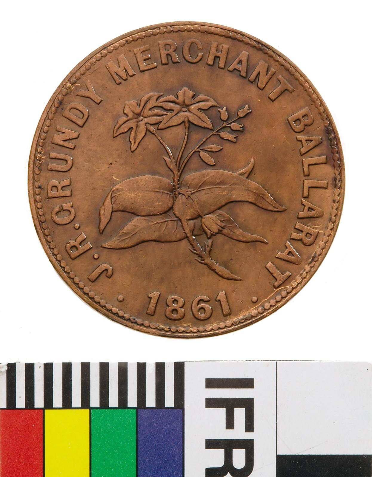 Obverse: J.R. GRUNDY MERCHANT BALLARAT 1861 Reverse: INDUSTRIA ET FIDES OMNIA VINCET VICTORIA