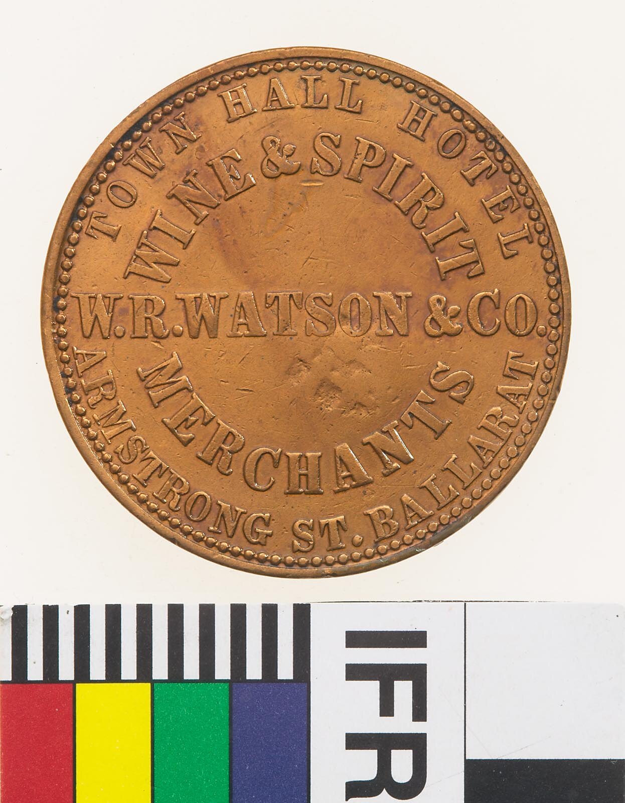 Copper One Penny Token, minted by Thomas Stokes, Melbourne. Issued by W.R. Watson & Co, Town Hall Hotel, Ballarat, Victoria, 1862. W.R. Watson is listed as the owner of Town Hall Hotel, Armstrong Street in the 1865 Ballarat Directory. An advertisement in the Ballarat Evening Post, January 1864 read 'Town Hall Hotel, and Wine and Spirit Stores, Armstrong Street. The Cheapest House in Ballarat. Single Bottle Department. Brandy 5s-, Gin 4s, Rum 3s, Whiskey 3s. Per bottle. Every article sold as imported. W.R. Watson and Co. Proprietors'.