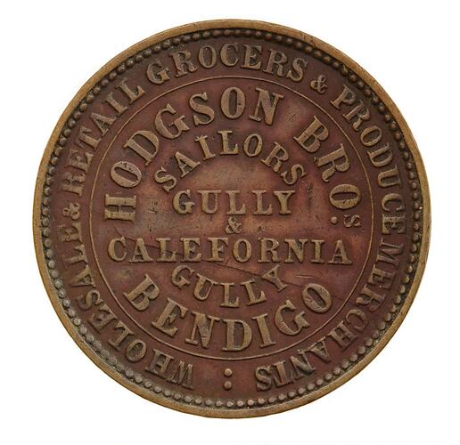 Obverse: HODGSON BROS. SAILORS GULLY & CALEFORNIA GULLY BENDIGO WHOLESALE & RETAIL GROCERS & PRODUCE MERCHANTS Reverse: VICTORIA 1862 ADVANCE VICTORIA T. STOKES MAKER 100 COLLINS ST. EAST MELBOURNE