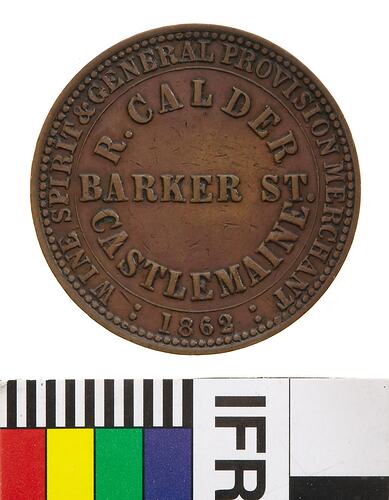 Obverse: R.CALDER BARKER ST. CASTLEMAINE WINE SPIRIT & GENERAL PROVISION MERCHANT 1862 Reverse: VICTORIA 1862 T. STOKES MAKER 100 COLLINS ST EAST MELBOURNE ADVANCE VICTORIA