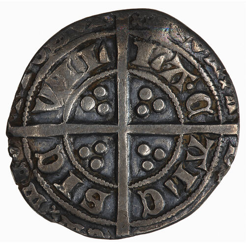 A long cross; in each angle three pellets; around, a legend in two concentric circles - the outer being mostly removed by clipping, in inner, VIL LA C ALC SIC