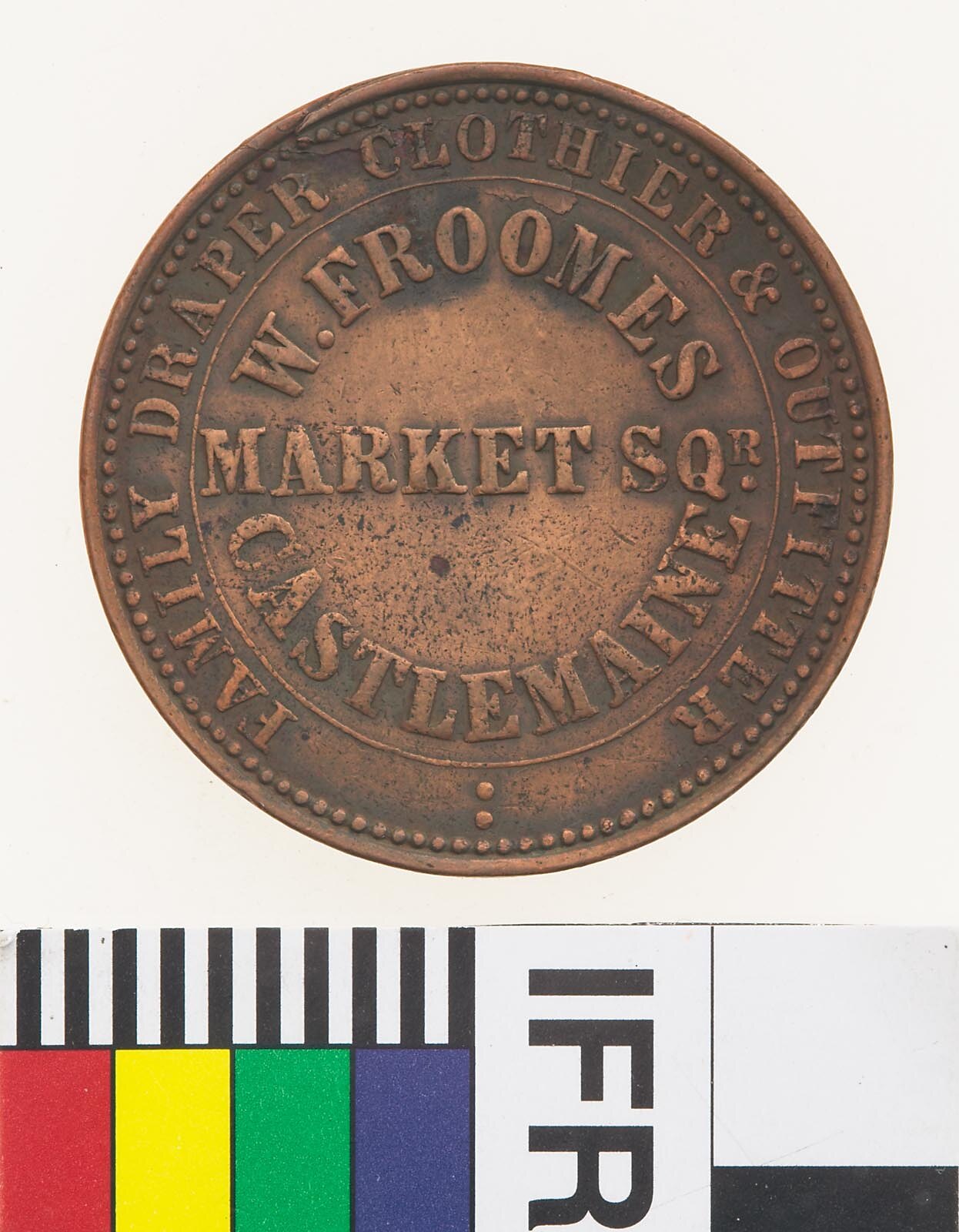 Obverse: W.FROOMES MARKET SQR. CASTLEMAINE FAMILY DRAPER CLOTHIER & OUTFITTER Reverse: VICTORIA 1862 T. STOKES MAKER 100 COLLINS ST EAST MELBOURNE ADVANCE VICTORIA