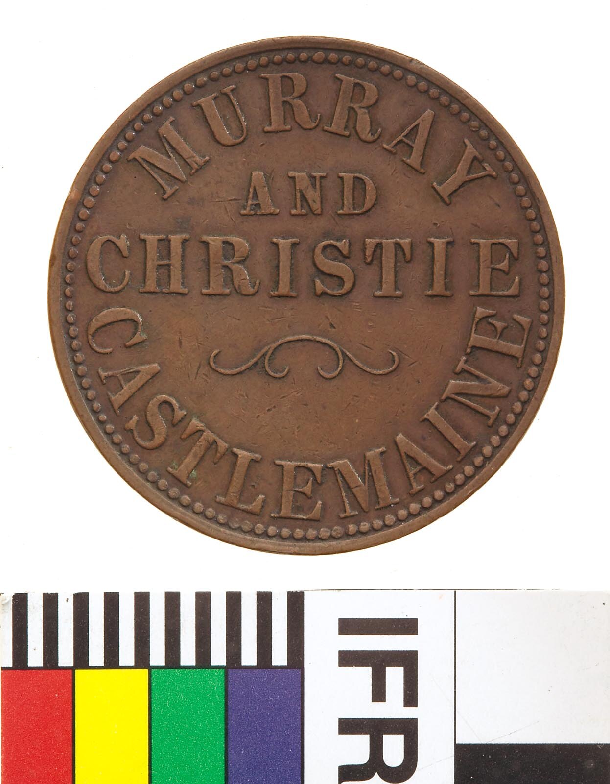 Copper One Penny Token, minted by Thomas Stokes, Melbourne. Issued by Murray & Christie, Castlemaine, 1862. In 1857 Murray joined Christie's business as a salesman. In 1861 they built another more substantial building on the same site. Unfortunately for them, when business slowed in Castlemaine in 1865 they had invested in the town heavily, purchasing a flour mill. They speculated in a range of pastoral, mining and property investments, all to their loss. David Murray became insolvent in 1871. Both men left Castlemaine in 1875, having speculated without much gain.
