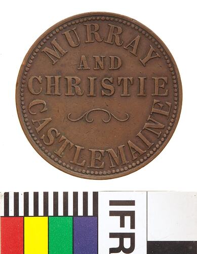 A round copper token (34 mm diameter). The token features the name, address and business of the issuer: Murray and Christie, Castlemaine grocers, ironmongers, China and glassware merchants.