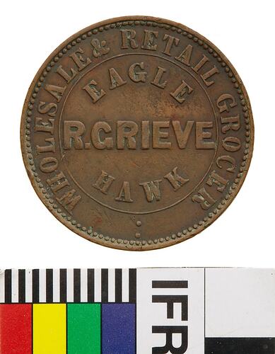 Copper One Penny Token, minted by Thomas Stokes, Melbourne. Issued by R. Grieve, Wholesale & Retail Grocers, Eaglehawk, Victoria, circa 1862. A native of Edinburgh, Grieve is thought to have migrated to Australia in 1852 or 1853. Grieve is thought to have worked for Dunn and Bayne in Eaglehawk from October 1853, managing that branch of their business from its opening. After some time he opened his own general store out of a canvas tent. When the land was subdivided into a township, he bought a block and built a substantial store there. Around 1865 he sold the business to his brother Thomas and moved to Melbourne. In Melbourne, Robert opened a store in South Melbourne. His manager was James Herschell. Between arriving in Melbourne and his retirement from active business in 1880, Grieve did well and opened several stores in the suburbs of South and Port Melbourne, making him one of the largest businessmen in that district.