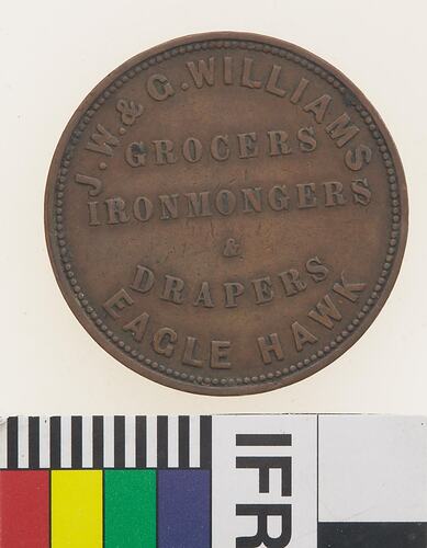 Copper One Penny Token, minted by Thomas Stokes, Melbourne. Issued by J.W.& G. Williams, Ironmongers & Drapers, Eaglehawk, Victoria, circa 1858. John Williams arrived in Melbourne from Yorkshire in 1849. His brother George joined him a year later and the brothers tried their luck in the Bendigo gold fields and ended up establishing a general store in Eaglehawk. They described themselves as 'ironmongers, grocers, drapers, gold office, wine and spirit merchant, and colonial produce merchant.' The brothers worked their store until 1876 when they terminated their partnership. John continued in their original business and George opened another store in the same town.