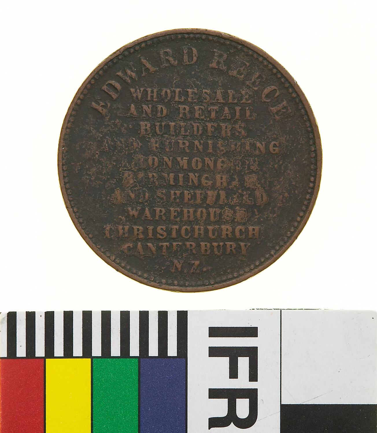 Obverse: EDWARD REECE WHOLESALE AND RETAIL BUILDERS AND FURNISHING IRONMONGER BIRMINGHAM AND SHEFFIELD WAREHOUSE CANTERBURY N.Z. Reverse: ADVANCE CANTERBURY NEW ZEALAND