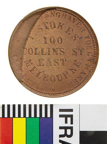 Obverse: T. STOKES 100 COLLINS ST. EAST MELBOURNE LETTER CUTTER SEAL ENGRAVER TOKEN MAKER Reverse: VICTORIA 1862 T. STOKES MAKER. 100 COLLINS ST. EAST MELBOURNE ADVANCE VICTORIA