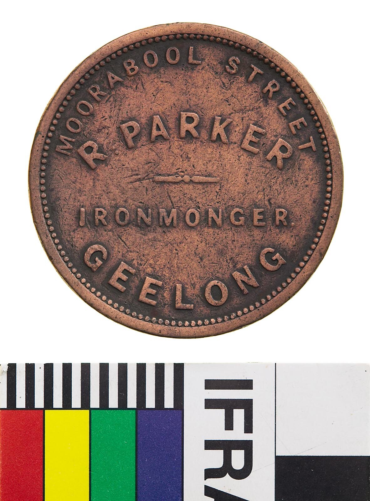 A copper token (34 mm diameter) featuring the name, address and business of the issuer: R. Parker, Moorabool St. Geelong, Ironmonger and on the reverse, a female figure representing Justice standing facing left. She wears a blindfold and extends a balanced set of scales with her right hand. With her left she holds an inverted cornucopia from which fruits flow onto the ground. She wears an ancient-style of flowing dress bound at the waist, her left arm is draped to near the elbow while drapery falls from her extended arm to below the horizon line behind; around above, AUSTRALIA. A three-masted sailing ship on horizon at left of token. This token has been cleaned and the reverse has re-toned green