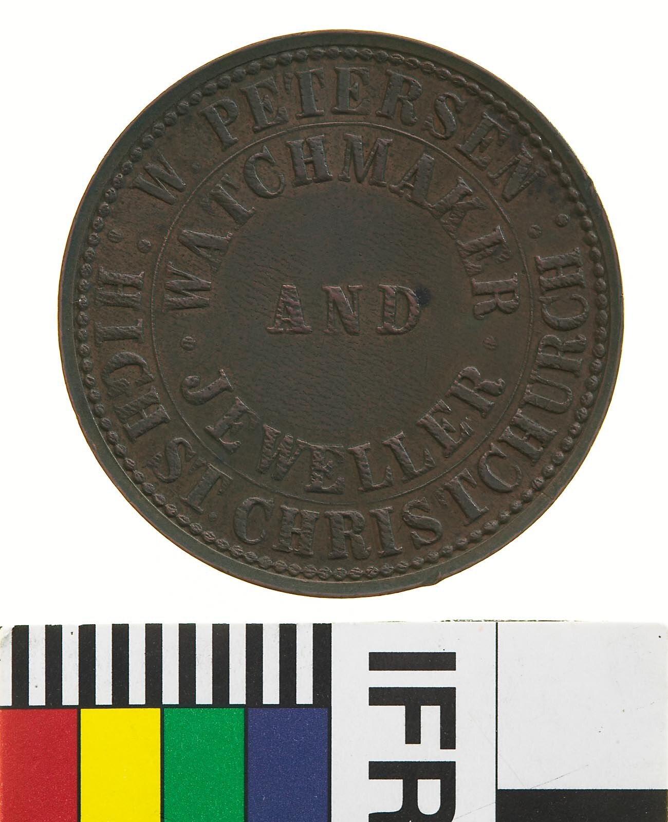 A round copper token (34 mm diameter) giving the name address and business of the issuer: W. Petersen, watchmaker and jeweller, High Street, Christchurch. The reverse depicts a pocket watch, a mantle clock and a trophy cup.