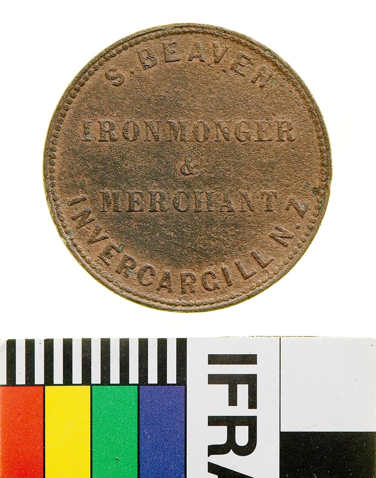 Obverse: S. BEAVEN IRONMONGER & MERCHANT INVERCARGILL N.Z. Reverse: PEACE & PLENTY 1863 ADVANCE AUSTRALIA