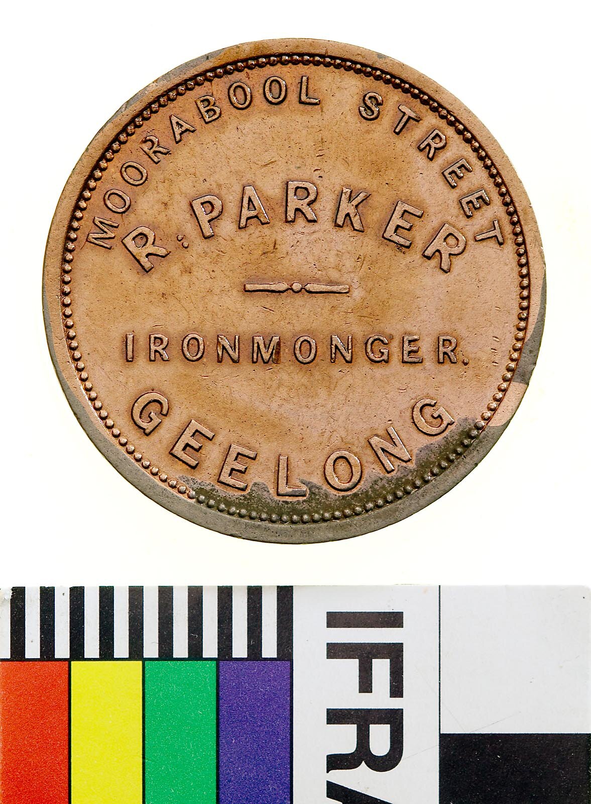 Obverse: MOORABOOL STREET R:PARKER IRONMONGER GEELONG Reverse: AUSTRALIA