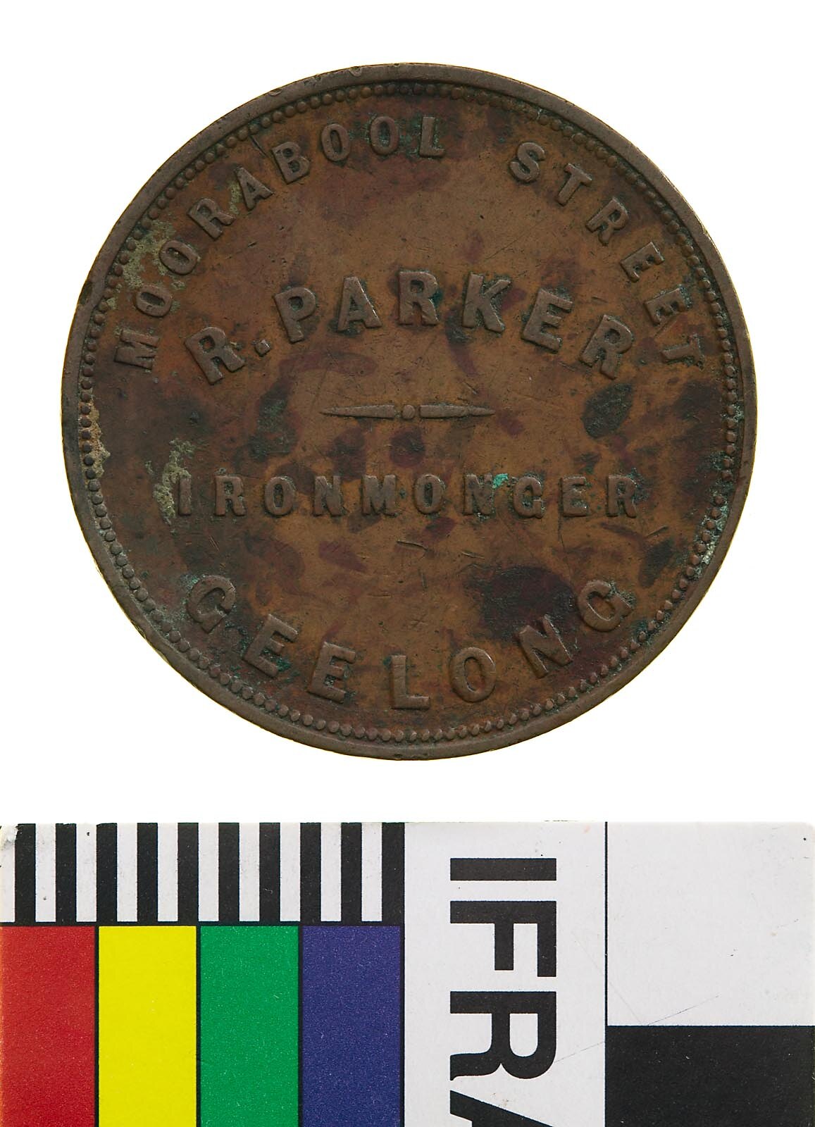 Obverse: MOORABOOL STREET R. PARKER IRONMONGER GEELONG Reverse: AUSTRALIA