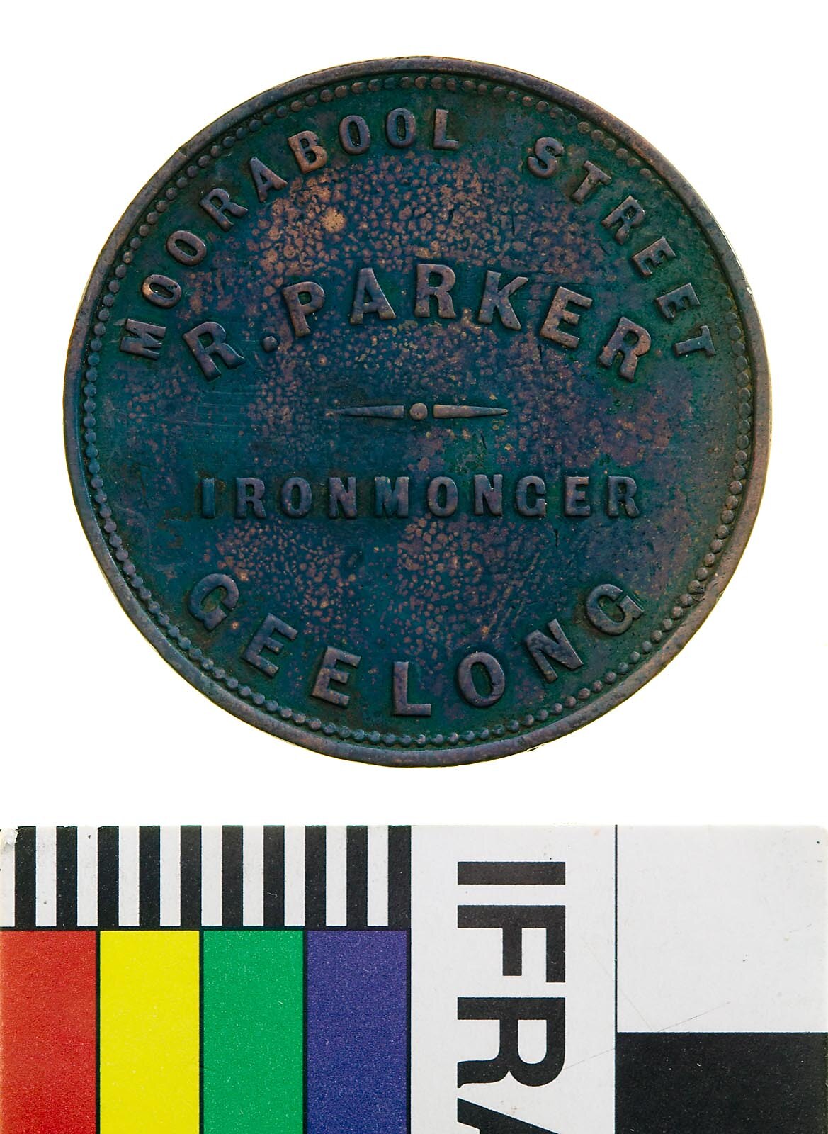 A copper token (34 mm diameter) featuring the name, address and business of the issuer: R. Parker, Moorabool St. Geelong, Ironmonger and on the reverse, a female figure representing Justice standing facing left. She wears a blindfold and extends a balanced set of scales with her right hand. With her left she holds an inverted cornucopia from which fruits flow onto the ground. She wears an ancient-style of flowing dress bound at the waist, her left arm is draped to near the elbow while drapery falls from her extended arm to below the horizon line behind; around above, AUSTRALIA. A three-masted sailing ship on horizon at left of token. This token has been cleaned and the obverse re-toned dark blue-green