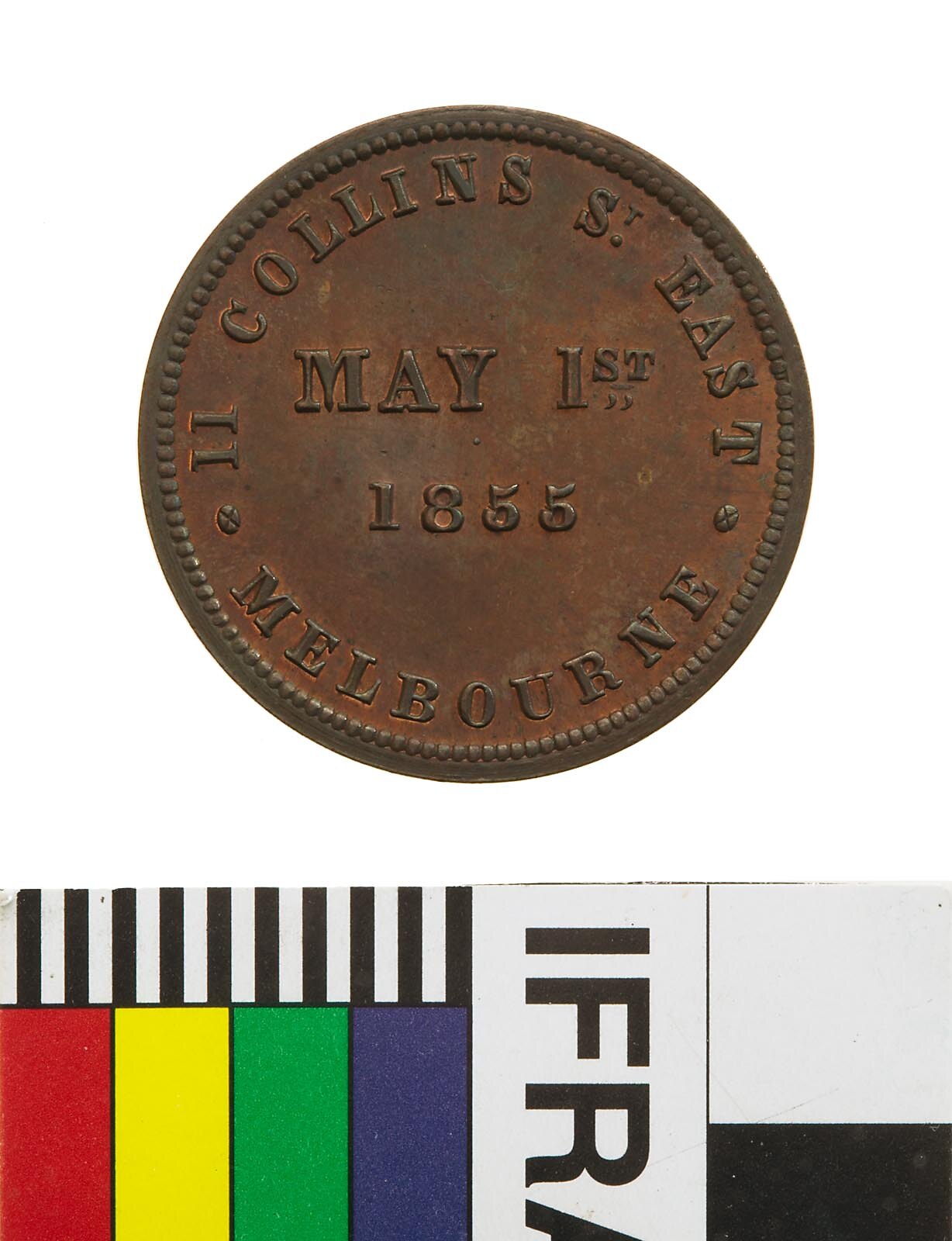 Around within a border of 123 beads; .11 COLLINS ST. EAST . MELBOURNE in two lines at centre, MAY 1ST. / 1855