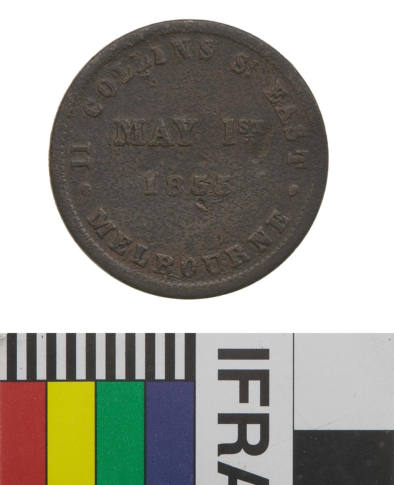 Around within a border of 123 beads; .11 COLLINS ST. EAST . MELBOURNE in two lines at centre, MAY 1ST. / 1855