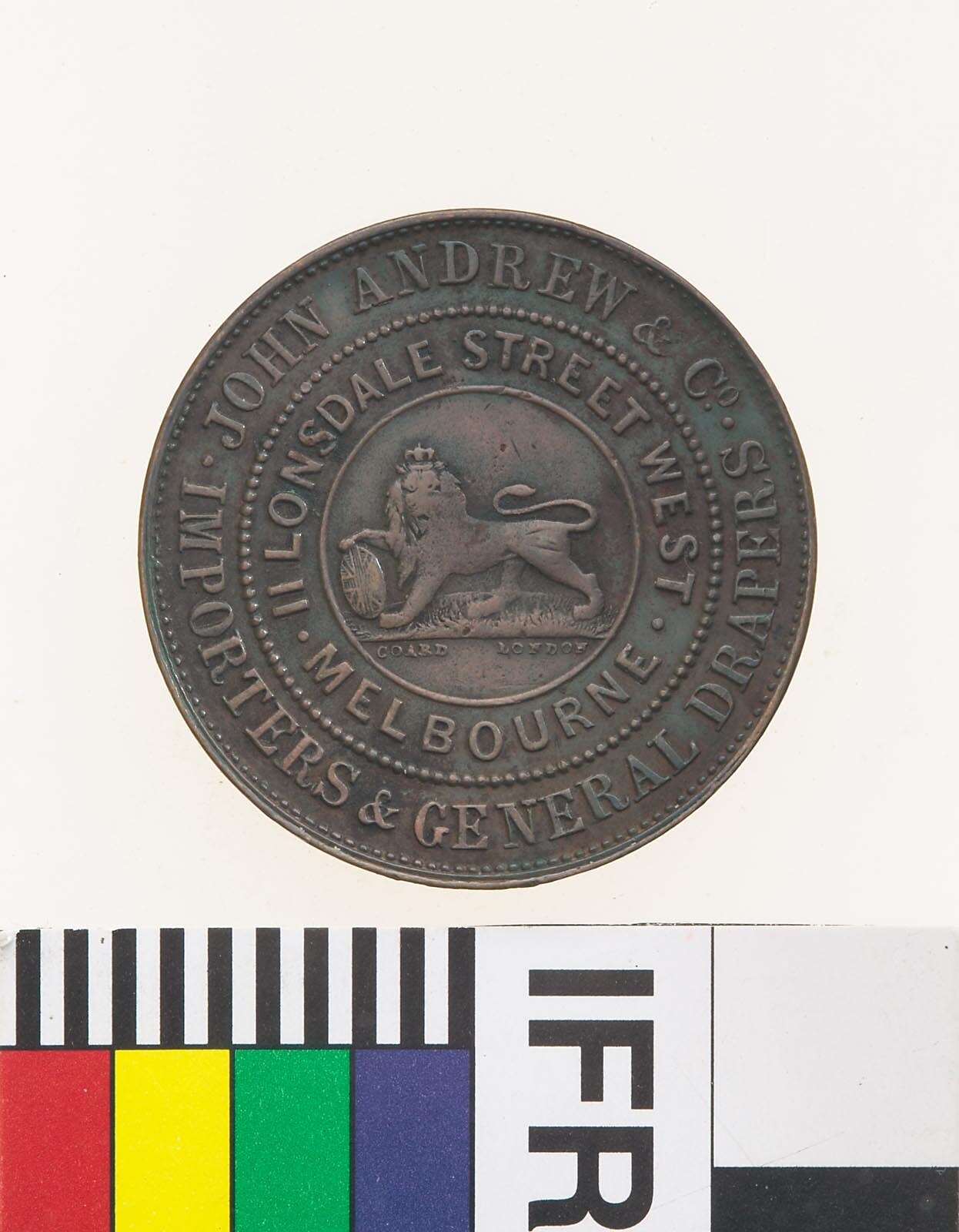 At centre, male lion standing to left with head crowned facing front, its right paw is raised and rests on a shield bearing the Union Jack, its tail curved back over its body. around in two concentric circles of text devided by a beaded circle * JOHN ANDREW & CO. * IMPORTERS & GENERAL DRAPERS / 11 LONSDALE STREET WEST * MELBOURNE * In small letters in the exergue below the lion, COARD LONDON