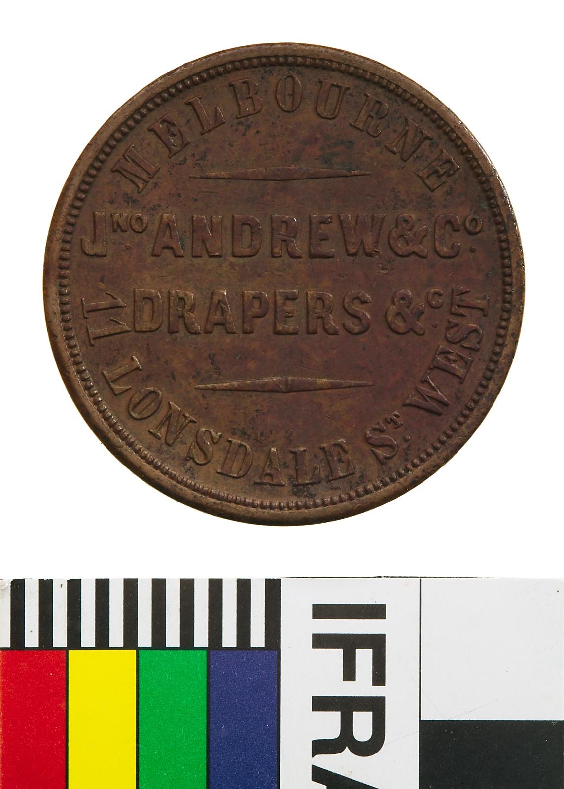 Obverse: MELBOURNE JNO ANDREW & CO DRAPERS &c 11 LONSDALE ST. WEST Reverse: MELBOURNE VICTORIA1860