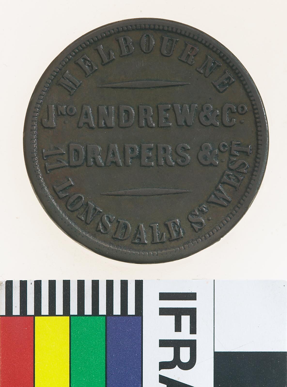 Copper One Penny Token, mint agent, Coard, London, minted by W.J. Taylor, London. Issued by John Andrew & Co, Drapers, Melbourne, 1862. John Andrew was apprenticed to the drapery trade in Glasgow and was later successful in his own drapery business in Scotland. He migrated to Australia in 1853. In 1854 he was listed in a Melbourne directory as the owner of a drapery and outfitting business in Lonsdale Street. In 1856 John married Ann Forbes, also from Wick. John sold his business in 1869 to Christie and Berwick and retired to live privately. In 1877 he was encouraged to stand for election to represent West Melbourne in the Legislative Assembly. He was duly elected and displayed his characteristic enthusiasm and progressive personality. At the end of his term, however, he retreated into retirement once again.