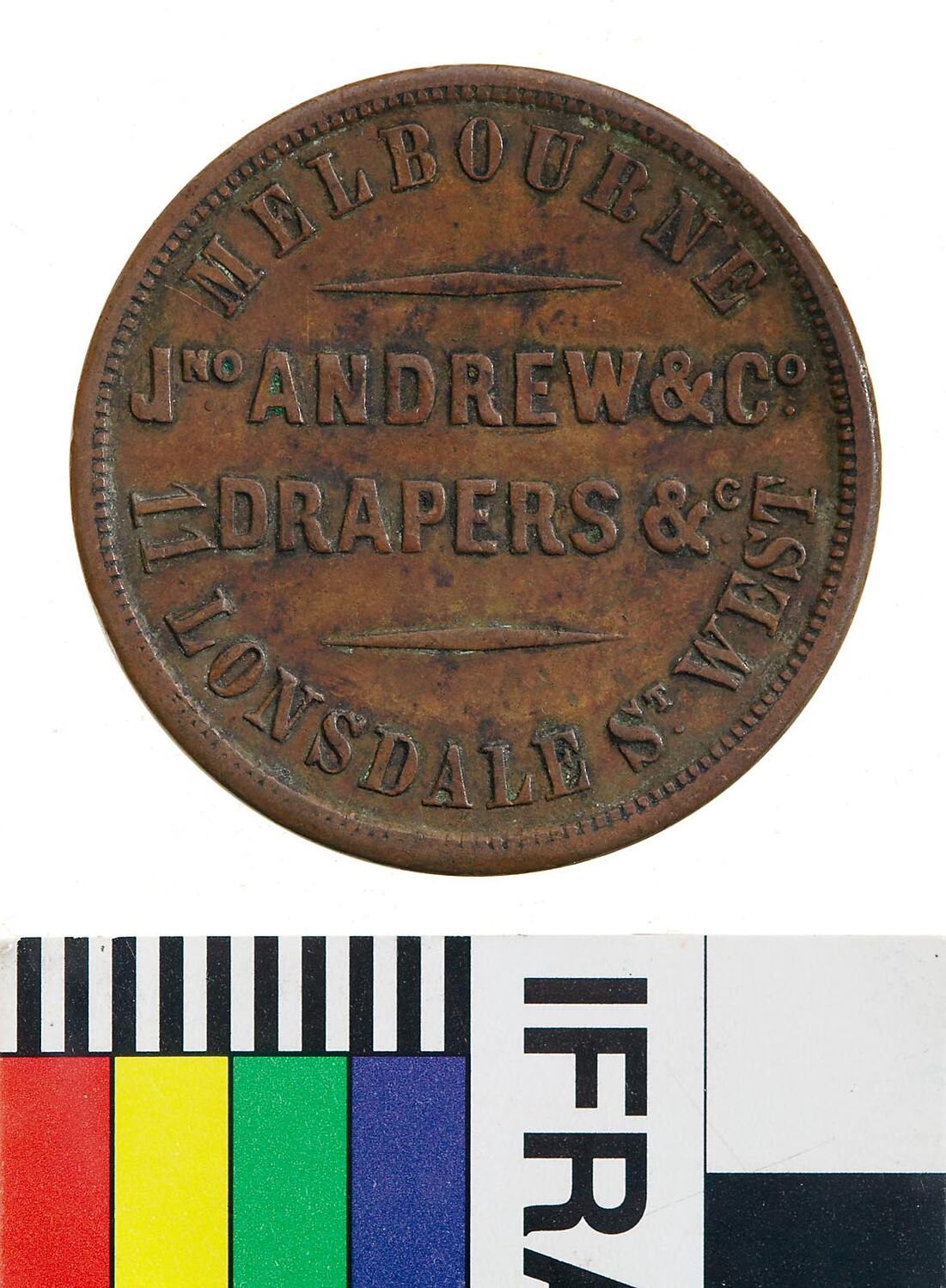 Obverse: MELBOURNE JNO ANDREW & CO DRAPERS &c 11 LONSDALE ST. WEST Reverse: VICTORIA COARD LONDON 1862