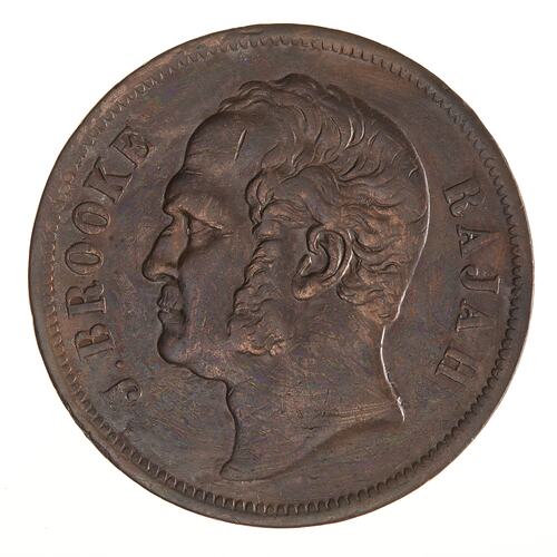 James Brooke, whose head appears on the obverse of this coin, became Rajah of Sarawak in 1842 after receiving the land and title from the Sultan of Brunie. In 1863, through his British agents Buchanan, Hamilton & Co. he arranged for copper coins with the denominations of 1/4, 1/2 and 1 Cent to be struck in Birmingham. This was the only issue in his name. The Spanish dollar was the principle silver coin of the region at the time and the copper coins were fractions of it. This piece may be a cast copy.