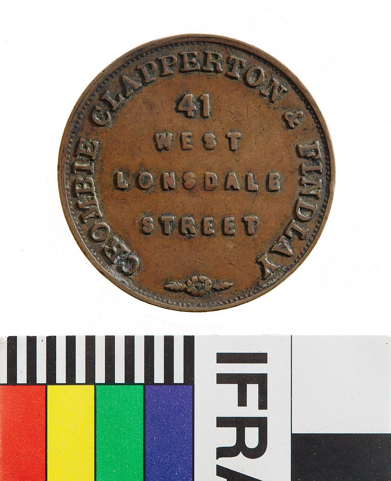 Obverse: CROMBIE CLAPPERTON & FINDLAY 41 WEST LONSDALE STREET Reverse: MELBOURNE W.J.TAYLOR, MEDALLIST TO THE GREAT EXHIBITION 1851