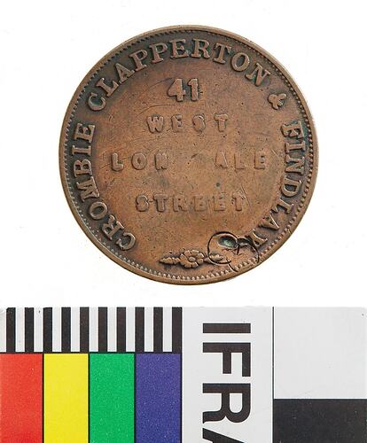 Obverse: CROMBIE CLAPPERTON & FINDLAY 41 WEST LONSDALE STREET Reverse: MELBOURNE W.J.TAYLOR, MEDALLIST TO THE GREAT EXHIBITION 1851