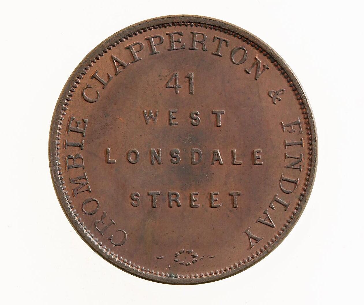 Obverse: CROMBIE CLAPPERTON & FINDLAY 41 WEST LONSDALE STREET Reverse: MELBOURNE W.J.TAYLOR, MEDALLIST TO THE GREAT EXHIBITION 1851