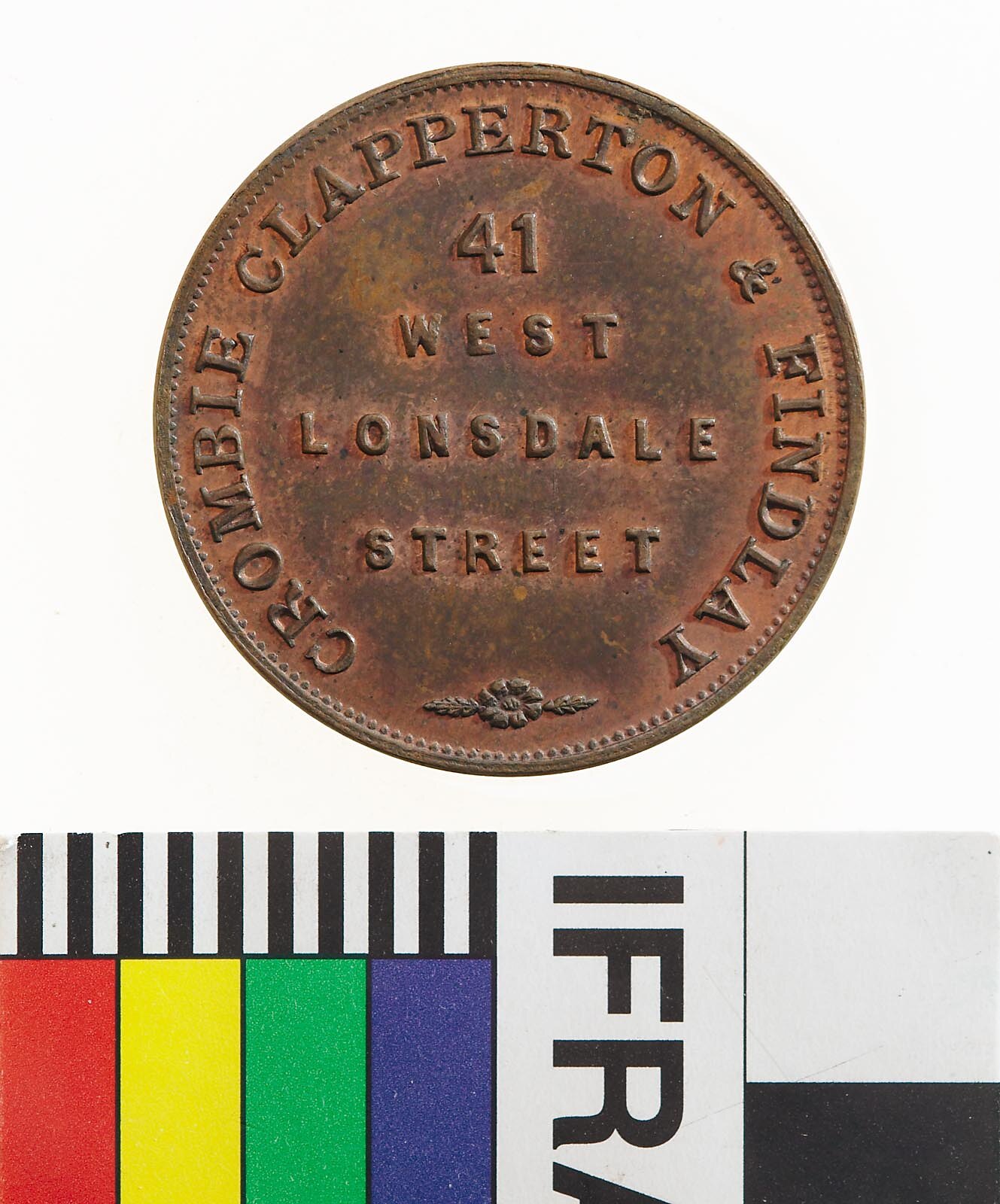 Obverse: CROMBIE CLAPPERTON & FINDLAY 41 WEST LONSDALE STREET Reverse: AUSTRALIA