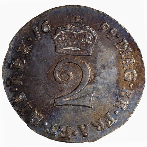 Crowned small numeral 2; around, MAG BR FRA ET HIB REX 1698, the date being divided by the crown