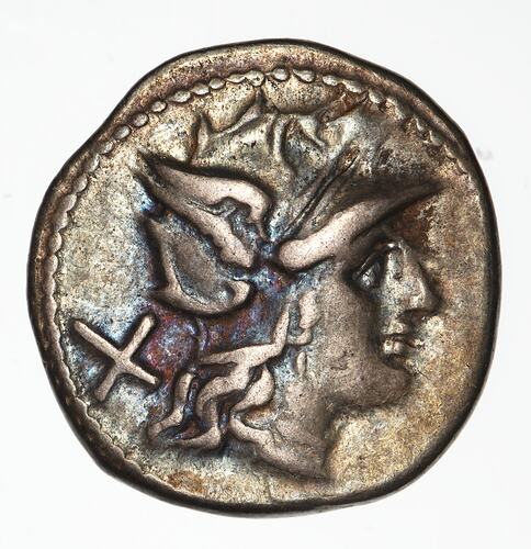 Helmeted head of Roma facing right; behind, the numeral X