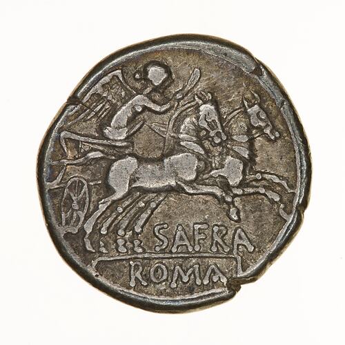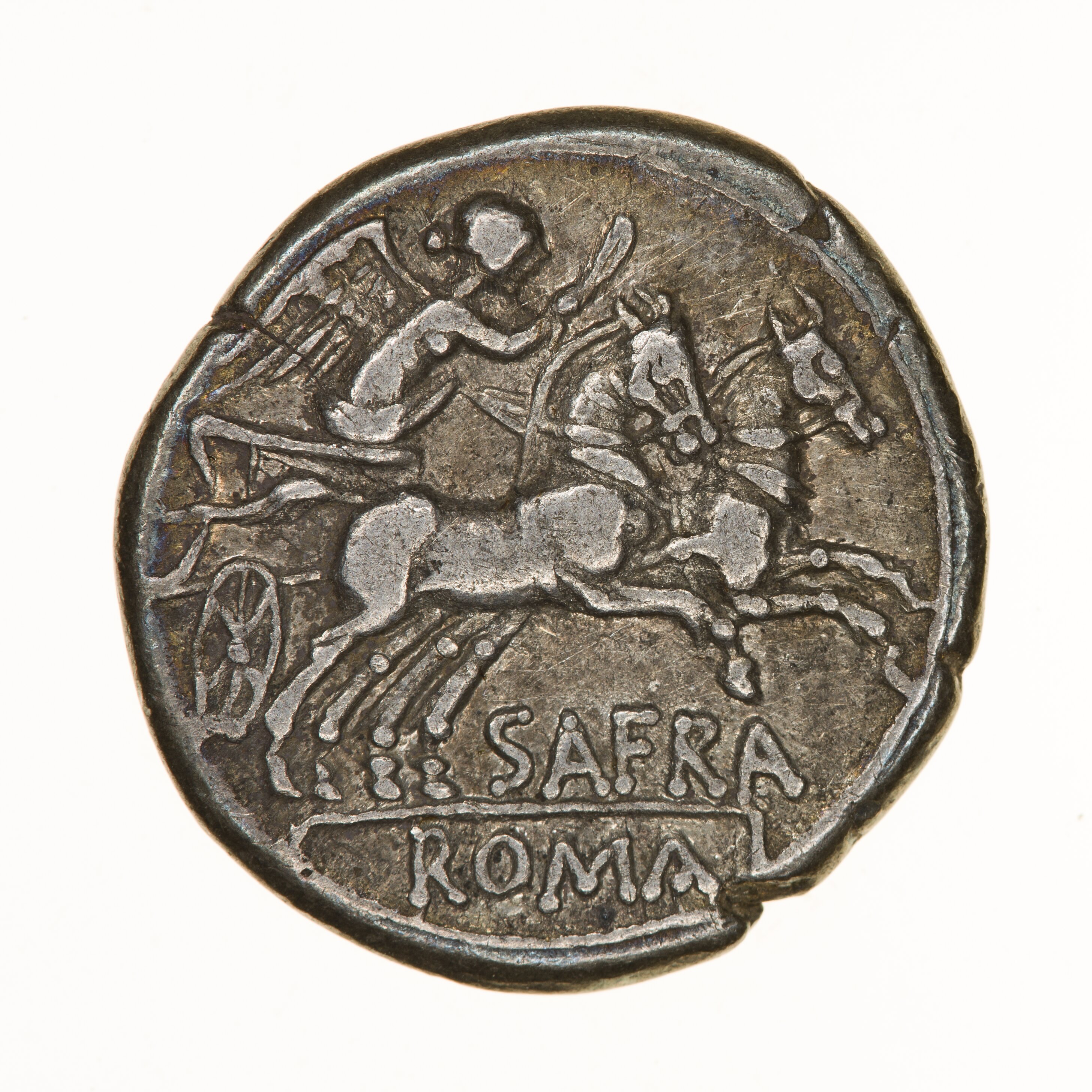 The Roman goddess Victory driving a fast biga to right; below, SAFRA; in exergue in linear box, ROMA