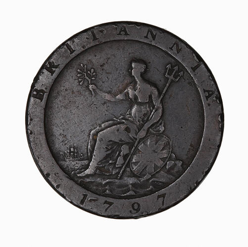 Britannia seated facing left on rock against which rests a shield with combines flags of St. Andrew and St. George, holding a trident and olive branch; among rocks below shield, SOHO; on horizon at left, three-masted warship sailing on horizon to right; around incuse on raised rim, BRITANNIA 1797