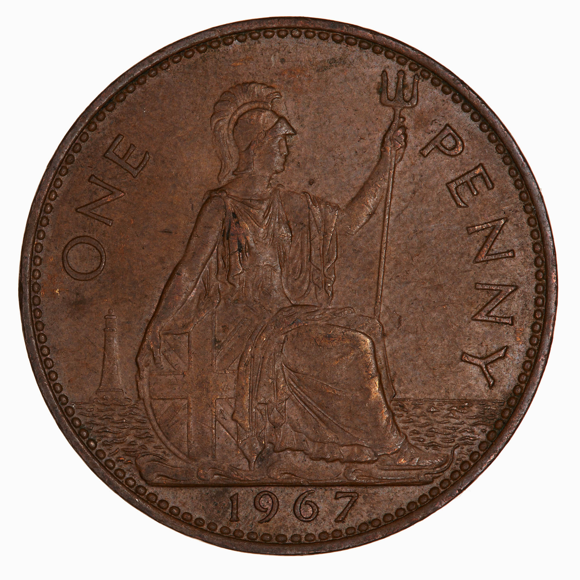 Britannia seated facing right on a rock wearing a helmet and flowing robes; she holds a trident and rests her right hand on a shield which bears the combined crosses of the Union Flag, behind her a lighthouse; around, ONE PENNY; in exergue,1967