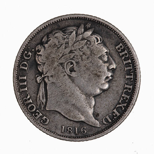 Laureate head of the King facing right; around, GEOR III D G BRITT REX F D ; below, 1816