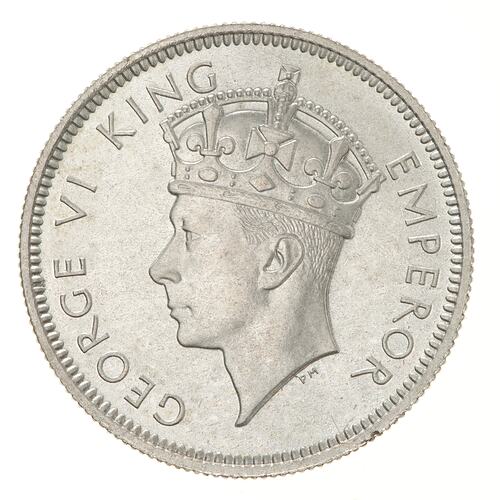 Crowned head of the King facing left; around, GEORGE VI KING EMPEROR, artist's initials, PM, below neck