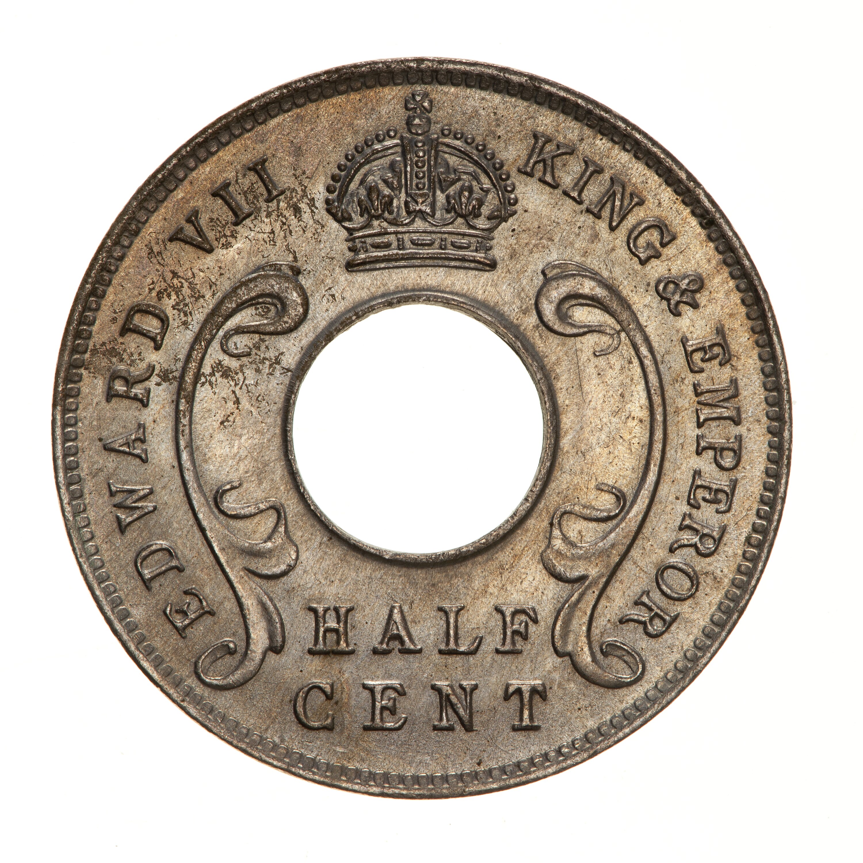 A central hole with curved floral design to left and right; above hole, crown; below hole in two lines, HALF / CENT; around, EDWARD VII KING & EMPEROR