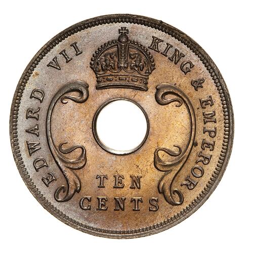 A central hole with curved floral design to left and right; above hole, crown; below hole in two lines, TEN / CENT; around, EDWARD VII KING & EMPEROR