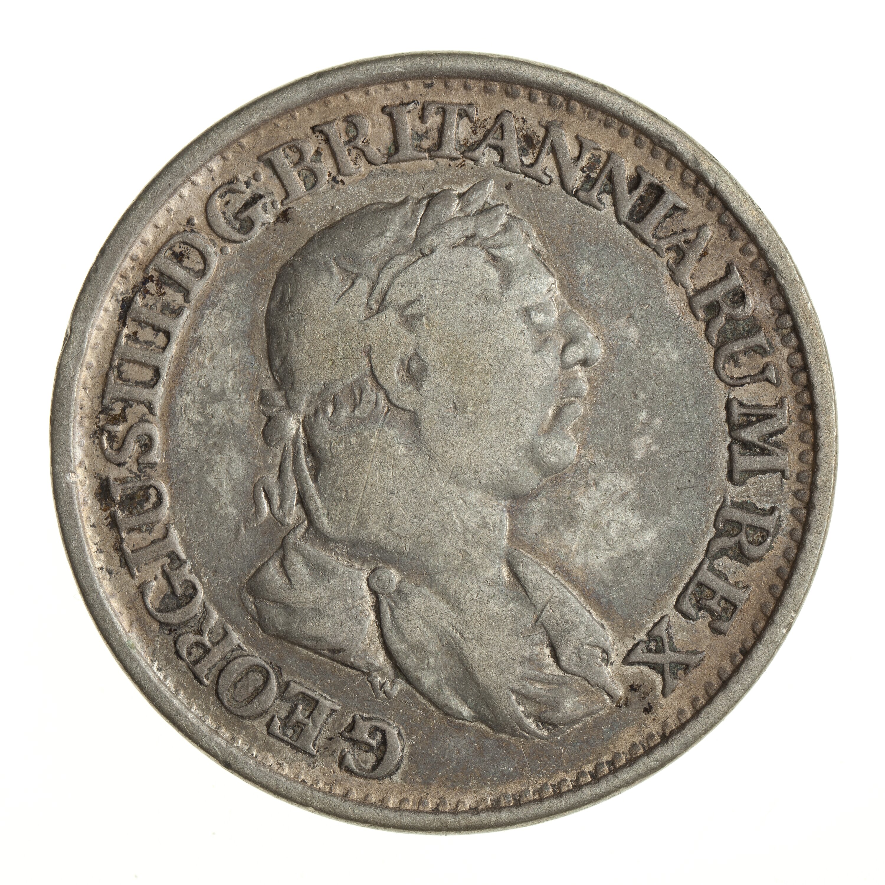 Laureate and draped bust of the King facing right; around, GEORGIUS III D: G: BRITANNIARUM REX
