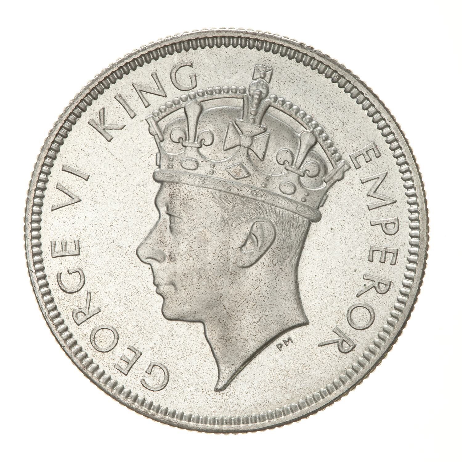 Crowned head of the King facing left; around, GEORGE VI KING EMPEROR, artist's initials, PM, below neck