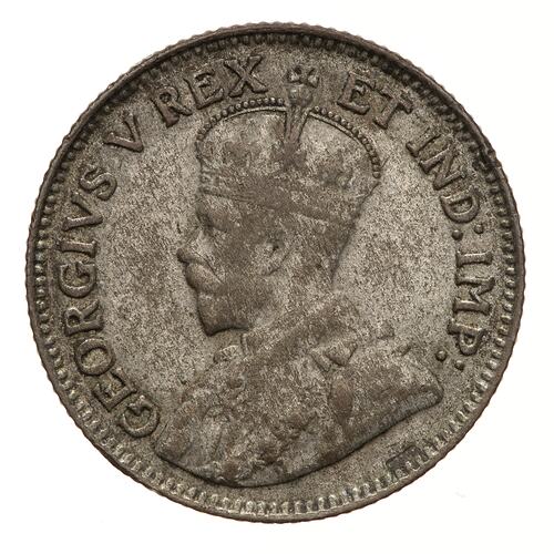 Crowned and draped bust of the King facing left, the King is wearing the Imperial Crown and the ermine Robe of State, the Collar of the Most Noble Order of the Garter, and the Badge of the Most Honourable Order of the Bath; around, GEORGIVS V REX ET IND: IMP:; artist's initial's, BM, on bust truncation