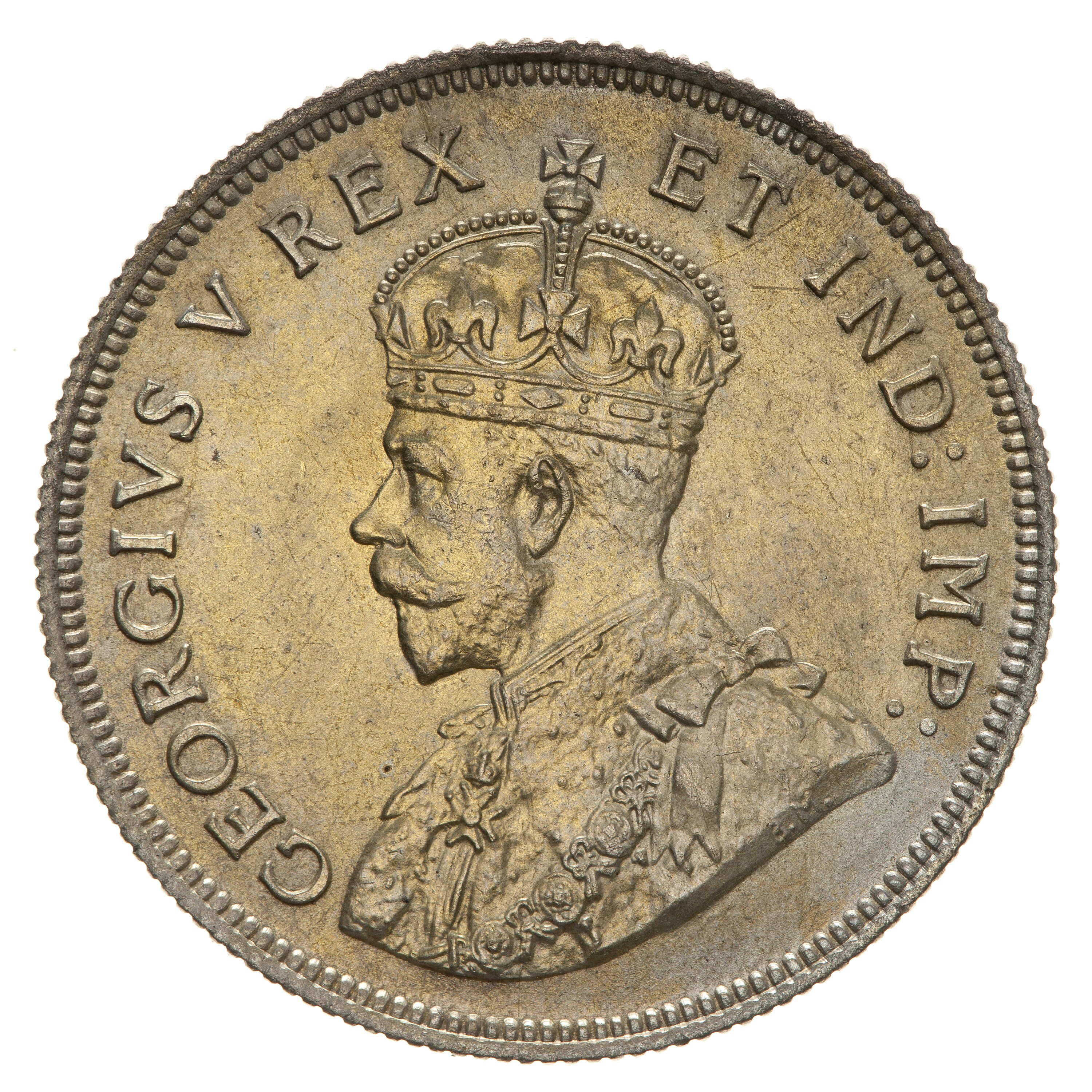 Crowned and draped bust of the King facing left, the King is wearing the Imperial Crown and the ermine Robe of State, the Collar of the Most Noble Order of the Garter, and the Badge of the Most Honourable Order of the Bath; around, GEORGIVS V REX ET IND: IMP:; artist's initial's, BM, on bust truncation