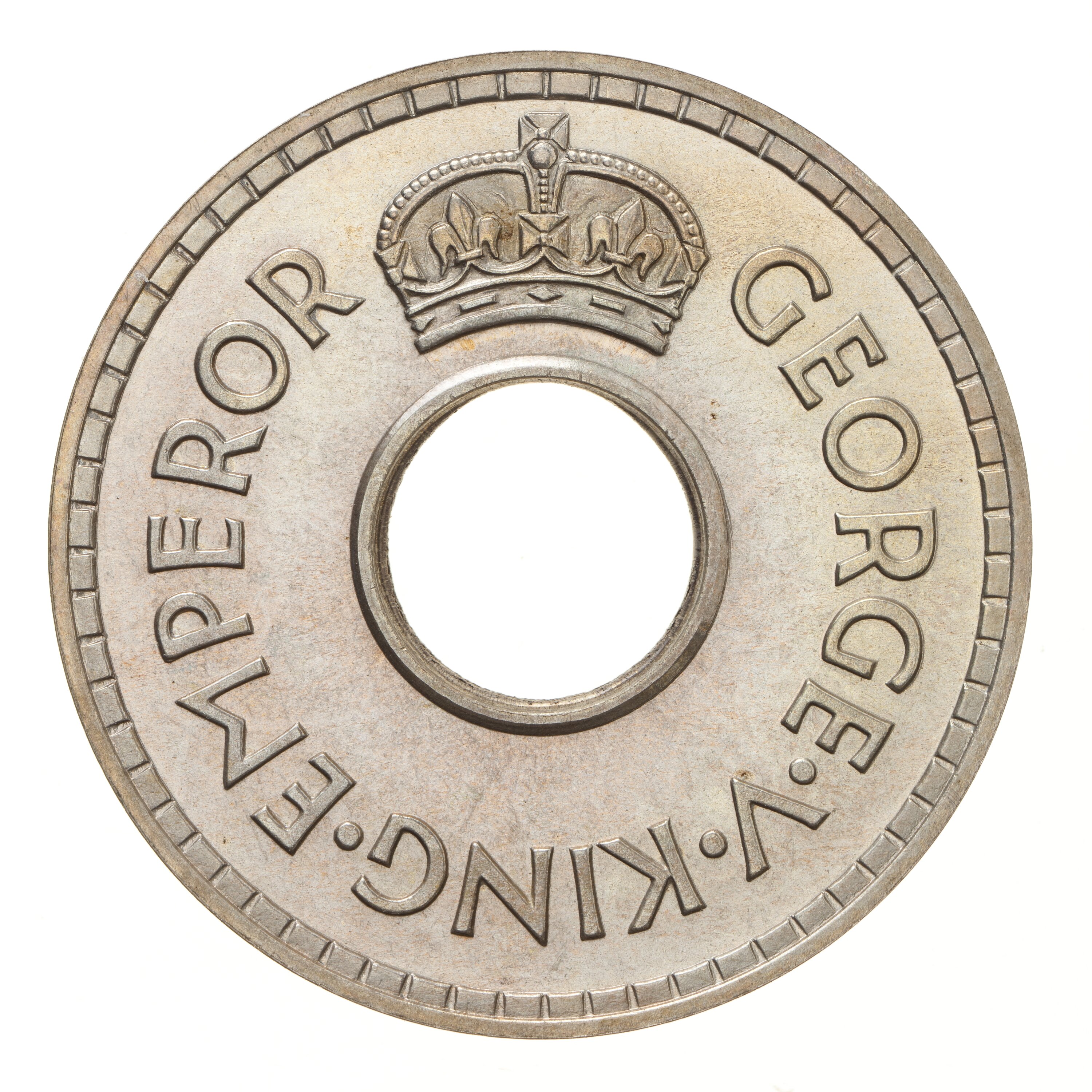 Above central hole, a crown; around, GEORGE V KING EMPEROR