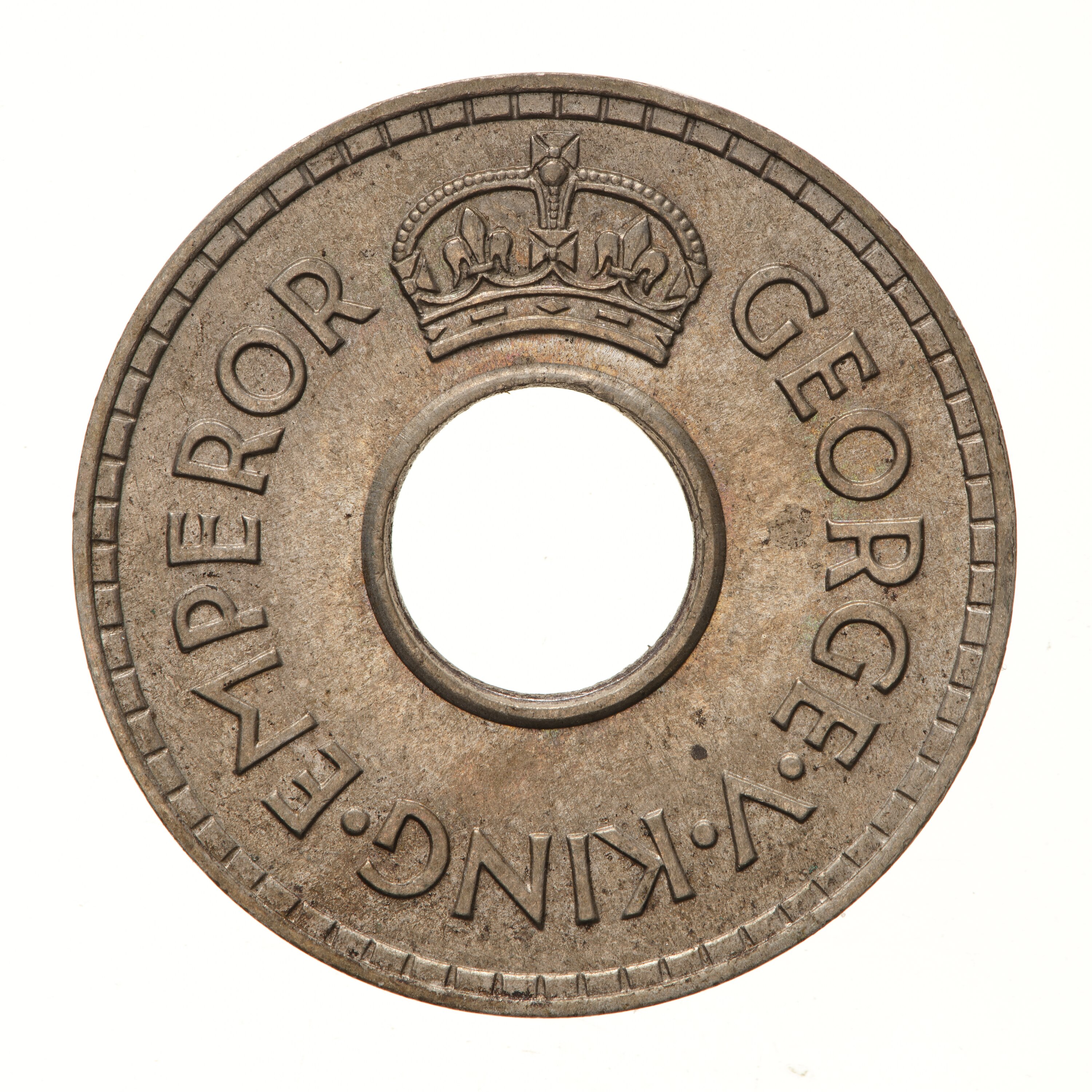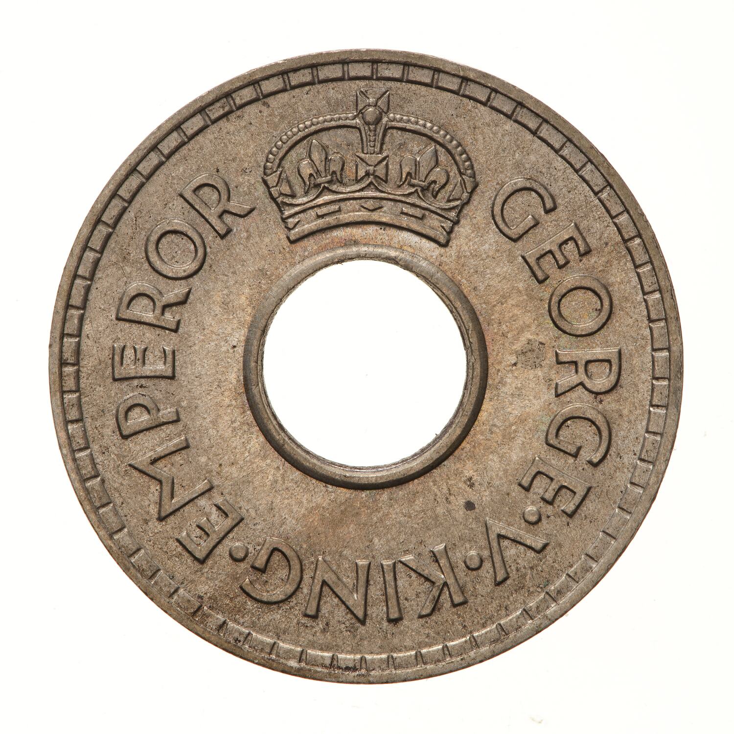 Above central hole, a crown; around, GEORGE V KING EMPEROR